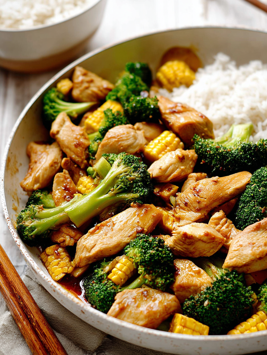 This Chicken Broccoli And Corn Stir Fry combines juicy seared chicken, vibrant broccoli florets, and bursts of sweet corn tossed in a rich garlic-soy stir fry sauce that coats every bite with a glossy, savory glaze.