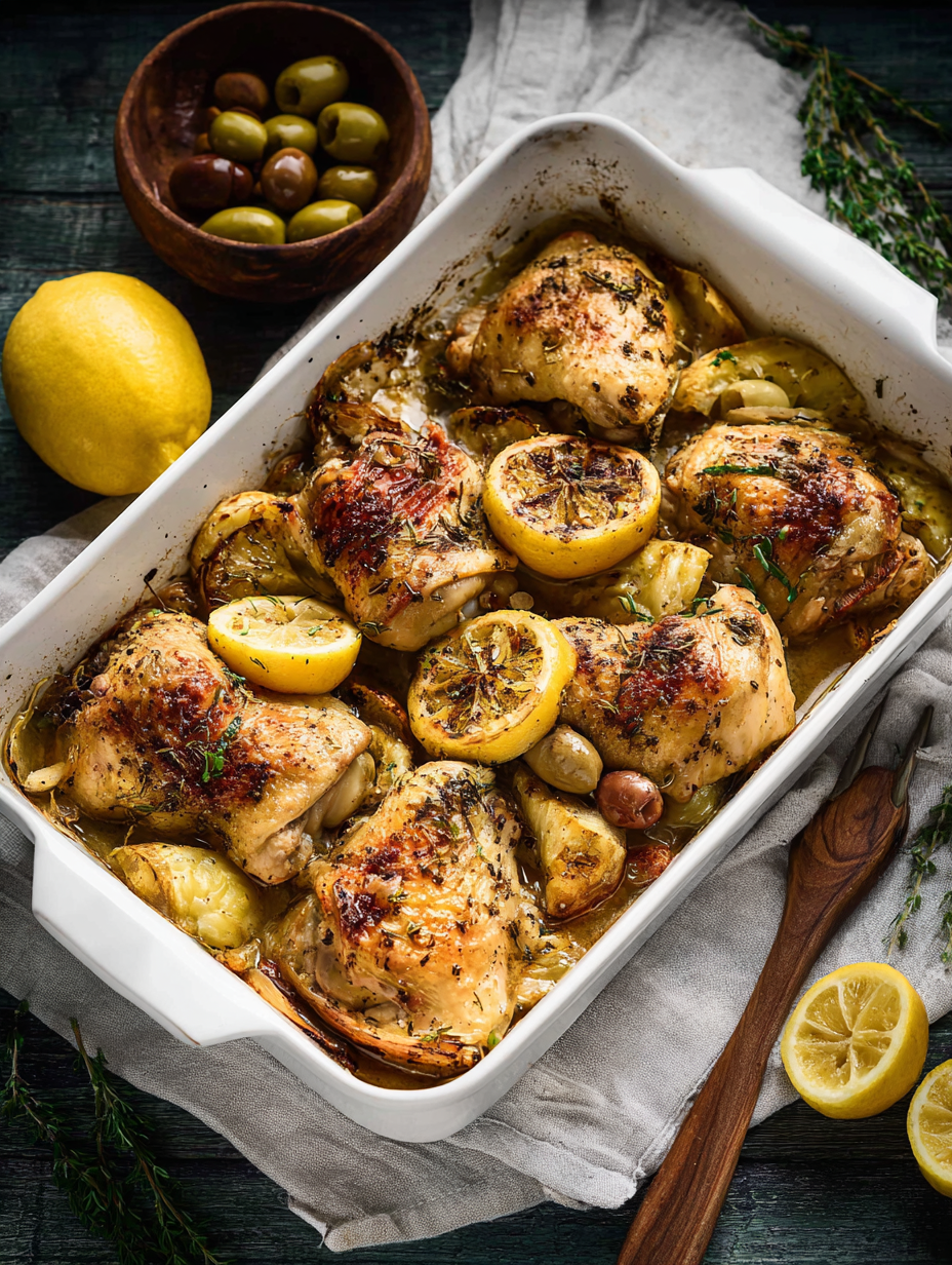 Greek Chicken Bake – Rustic Mediterranean Lemon Chicken With Roasted Potatoes, Garlic, Herbs, And Briny Olives