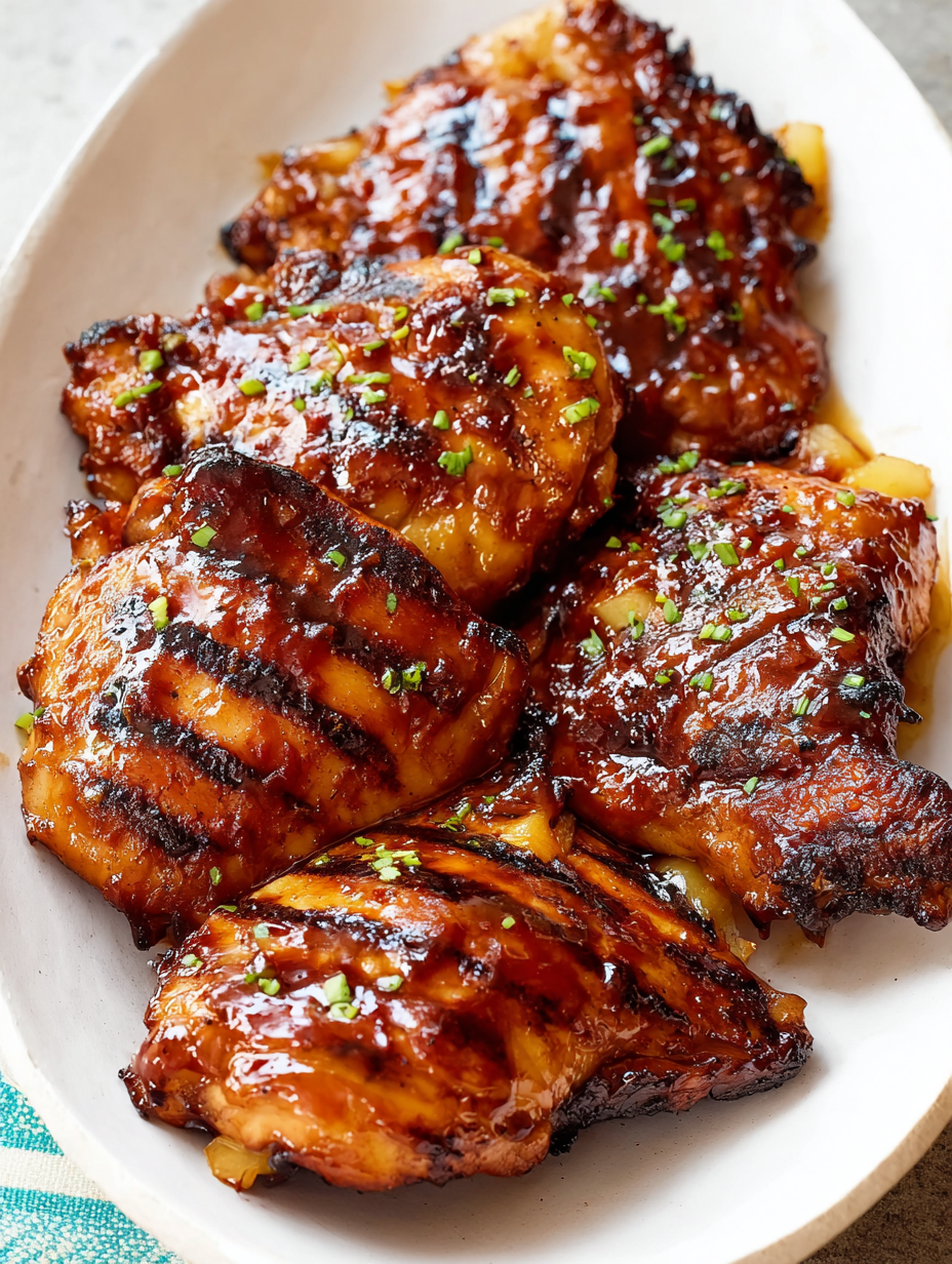 The sauce caramelizes beautifully while cooking, creating that signature sticky finish that clings to every bite of chicken. Paired with grilled pineapple and a sprinkle of fresh green onions, it becomes the kind of dish that looks as stunning as it tastes.