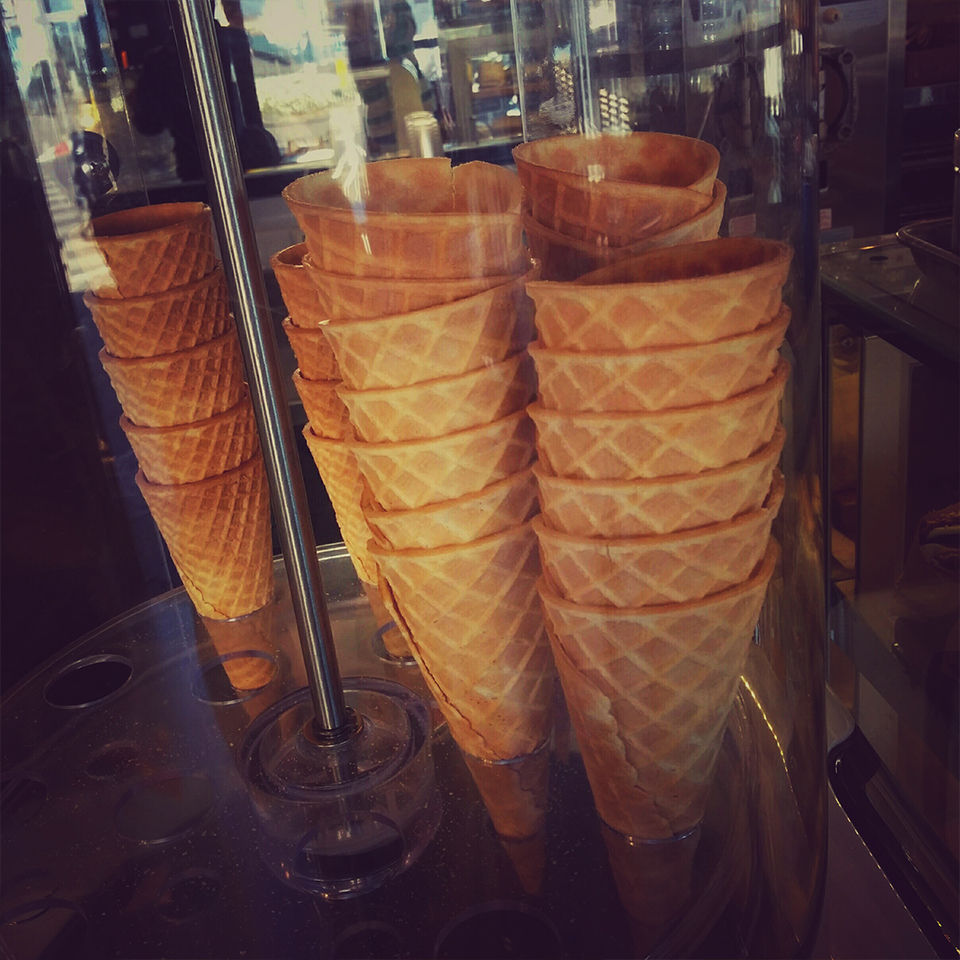 Then: Cones were hand-rolled from waffles or wafer-like batter, varying in size and texture.