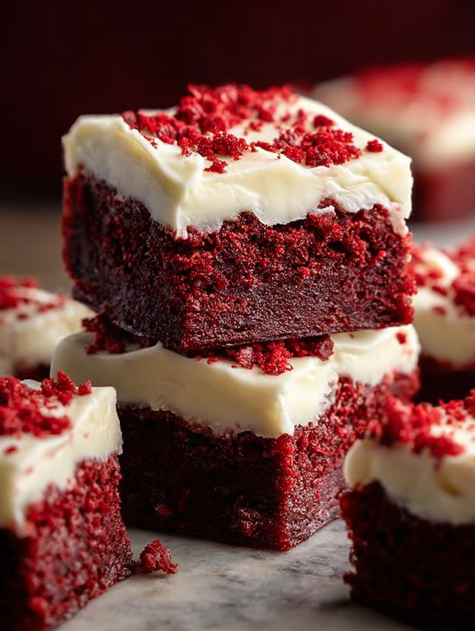 A thick layer of cream cheese frosting on top finishes everything with a cool, velvety contrast, and a few crumbs or tiny cubes of red brownie scattered over the frosting make every square look like it came from a bakery display case.